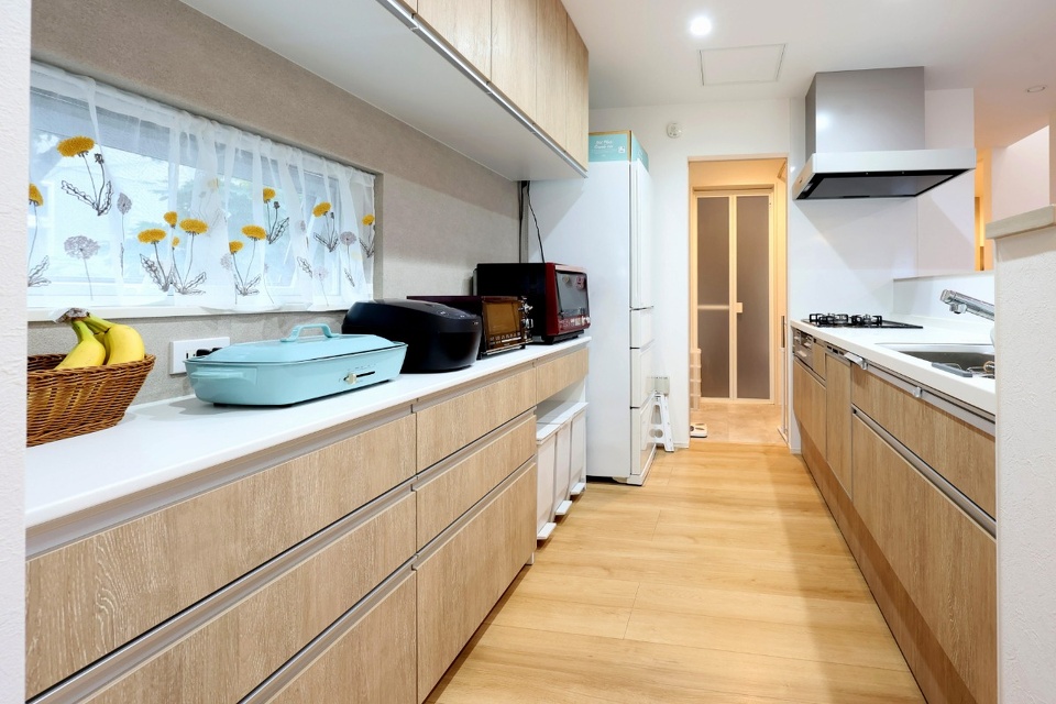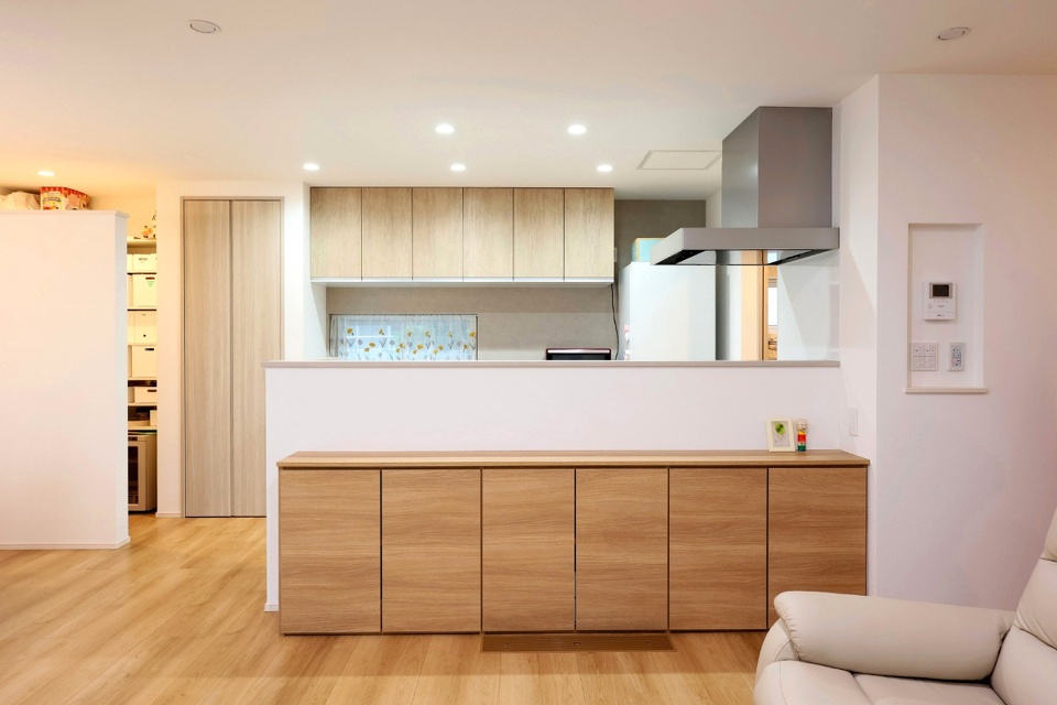 対面キッチンには腰壁を設け、手元が見えないように配慮しました。手前にある大容量の収納カウンターには、学校のプリント類やヘアゴムなどの身だしなみ用品を収納して、朝の支度に必要なものを1箇所にまとめられるようにしました。