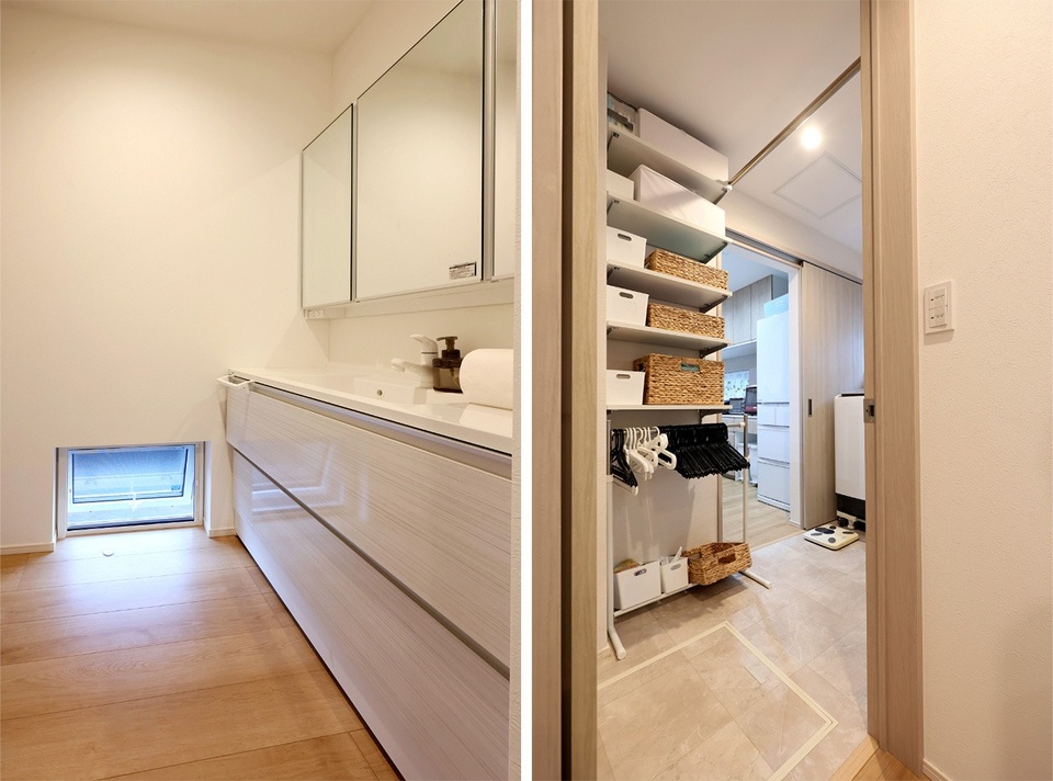 (写真左)地窓からの採光で明るい洗面室。