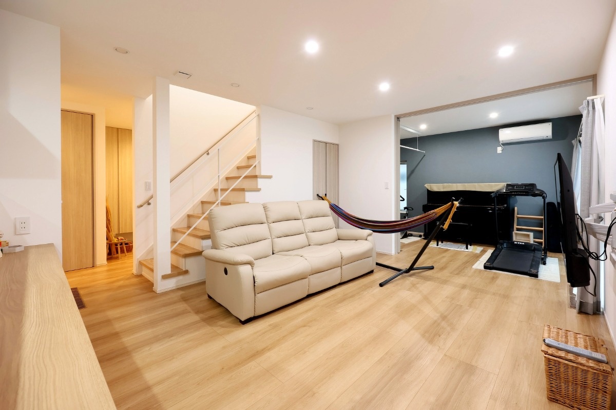 玄関とリビングを仕切る扉がない構造は、高気密・高断熱の高性能住宅だからこそ実現する間取りです。