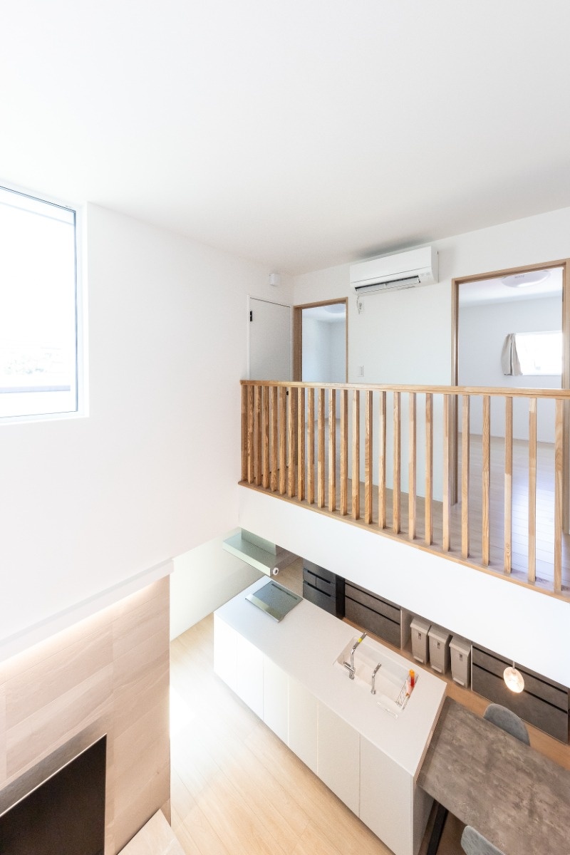 白い壁と明るい木目・吹き抜けで繋がる開放的な室内