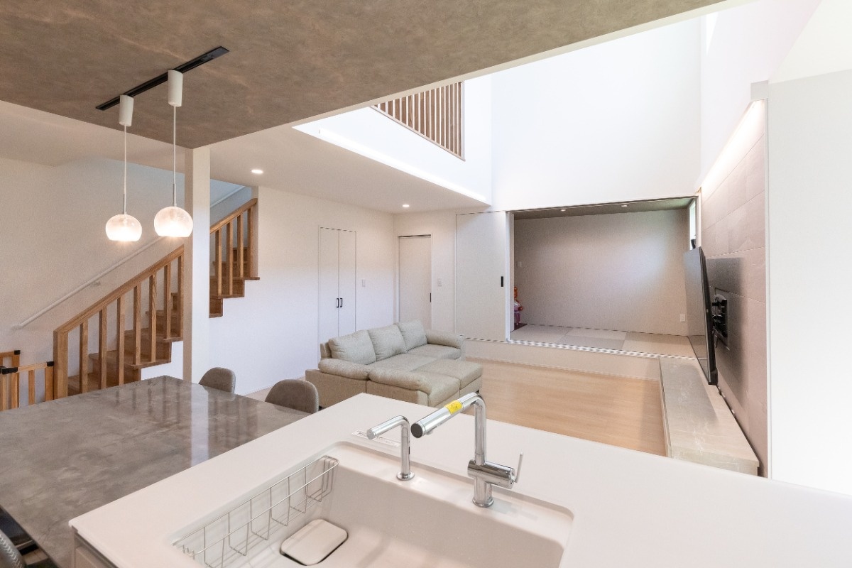 「どこにいても家族の様子を見守ることができる家にしたかった」という奥さま。キッチンからはリビング全体を見渡すことができ、吹き抜けを介して2階にいる家族ともコミュニケーションが取りやすい造りです。
