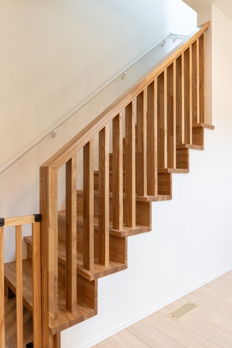 白い壁にキレイな木目が映えるリビング階段は、手すりも踏み板も耐久性のあるタモ材を使用しています。