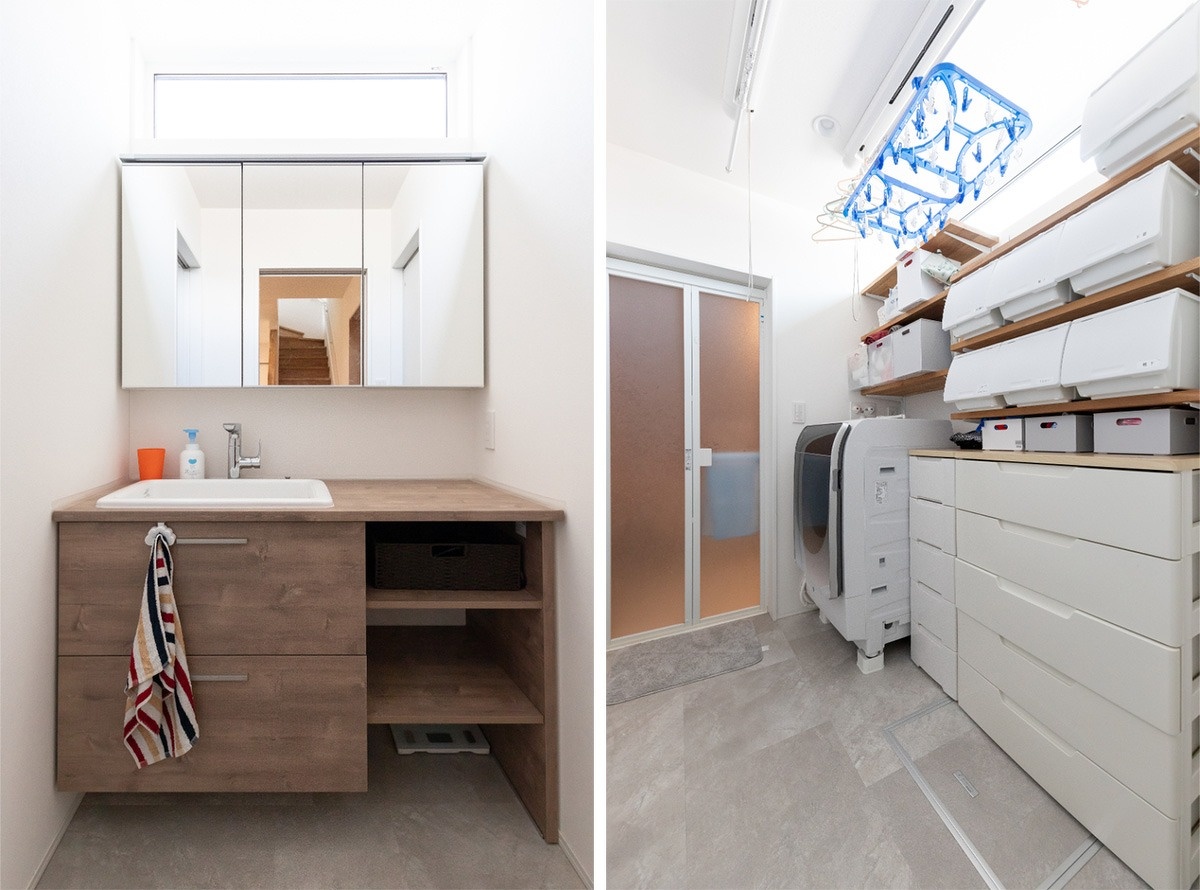 ランドリースペースの造作棚には収納ケースがピッタリと収まっています。