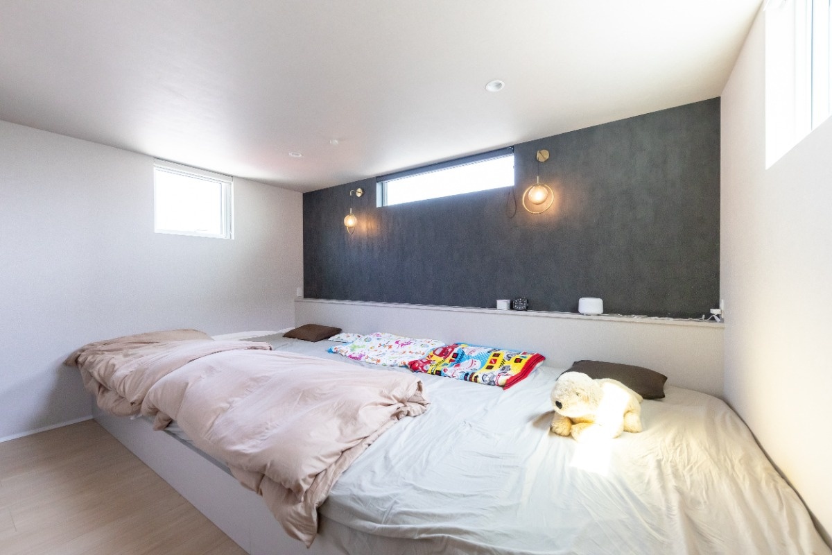 「家族みんなで一緒に寝たい」というKさんの希望を聞いて、白田さんが提案したベッドは、子どもたちの成長に合わせて長く使えるように1台ずつセパレートできる仕様になっています。