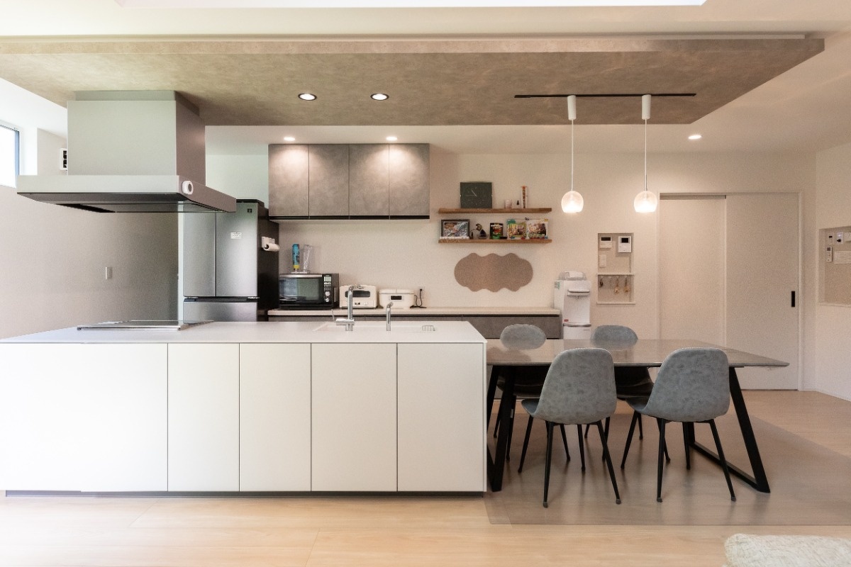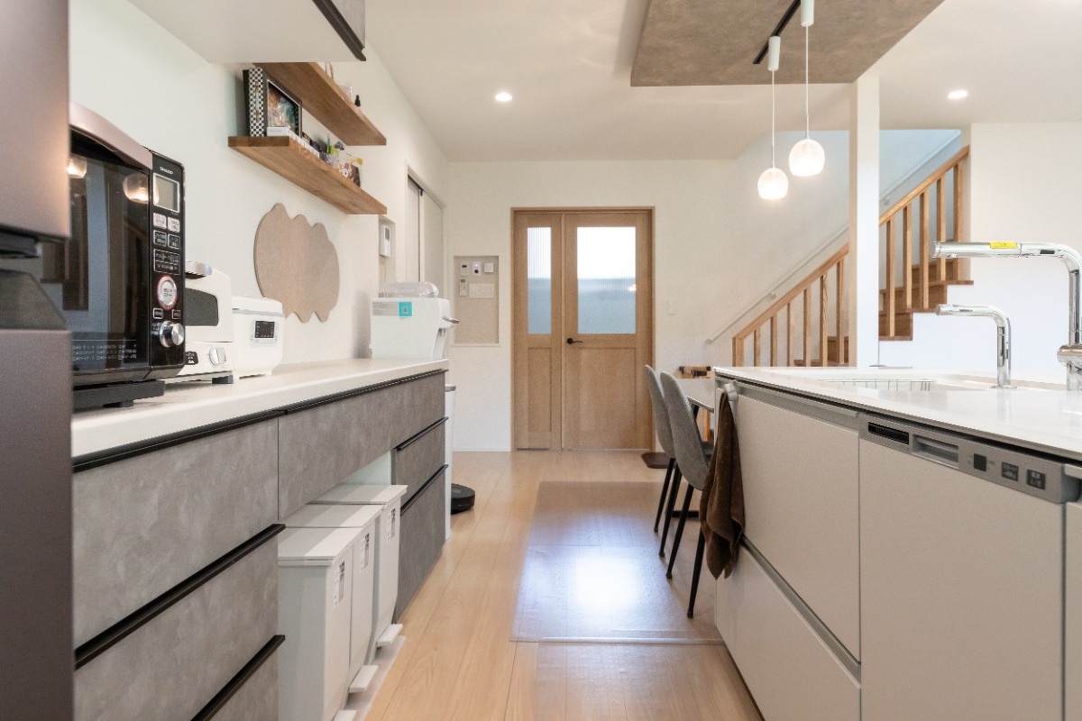 グレーをアクセントカラーにしたダイニングキッチン。配膳がしやすい横並びの配置で、家事動線をコンパクトにすることができました。下がり天井を背面収納と同系色にすることでキッチン全体に統一感が生まれています。