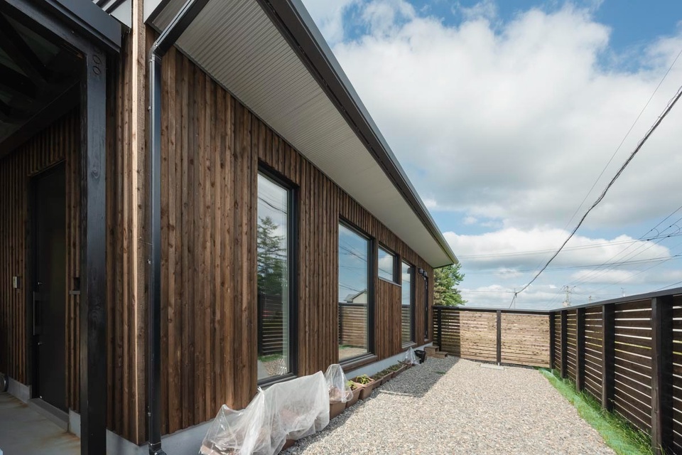 水野建設らしいカラマツ外壁に、鋳物の煙突が映える外観です。木の存在感を前面に出しても”山小屋風”にならず、洗練された印象に見える秘密は?と訊ねると、「屋根の形状をシャープにしたり、軒と雨どいを一体化させたり。社長の細かいこだわりがあるんですよ」と担当の水野円さん。外壁の張り方も、メンテナンス性とデザイン性の両立を考えて施工されているそうです。