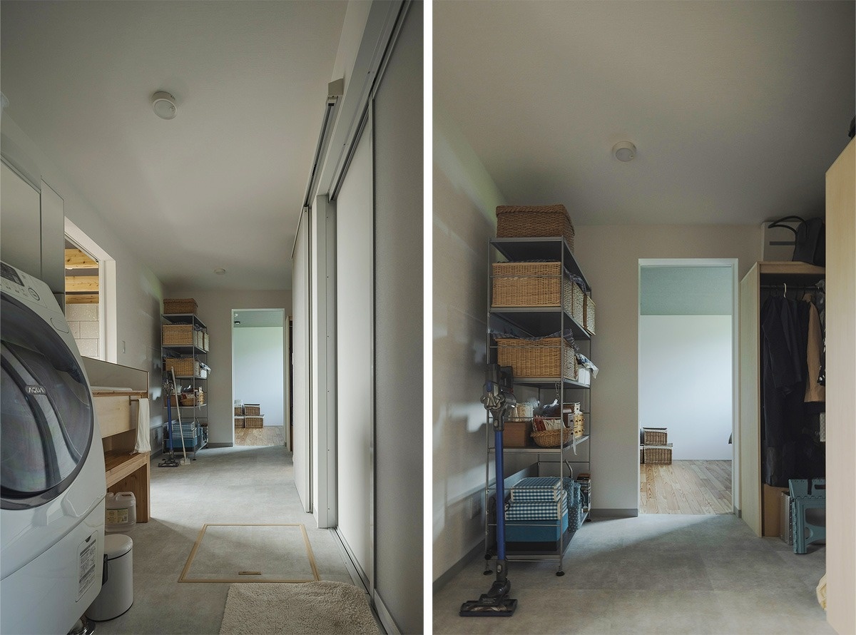 浴室・脱衣所・洗面所から各個室までは一直線。写真右の右奥はファミリークローゼットです。最短の動線で暮らせる間取りも、この家のゆったりとした時間の流れにつながっています。