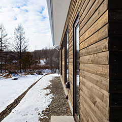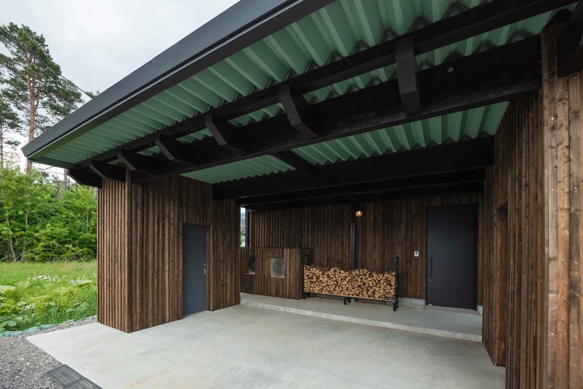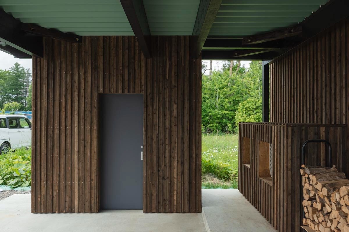 カーポートと物置も同じカラマツで製作しました。家の内側だけでなく外側にもなるべく既製品ではなく自然素材を使うことで、統一された素材感やデザインを実現しています。