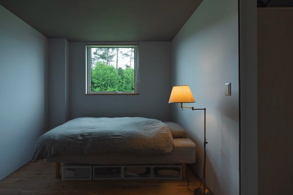 「鳥のさえずりで目覚められる」という主寝室。シンプルな内装と柔らかなフロアランプの明かりが落ち着いた空間をつくっています。