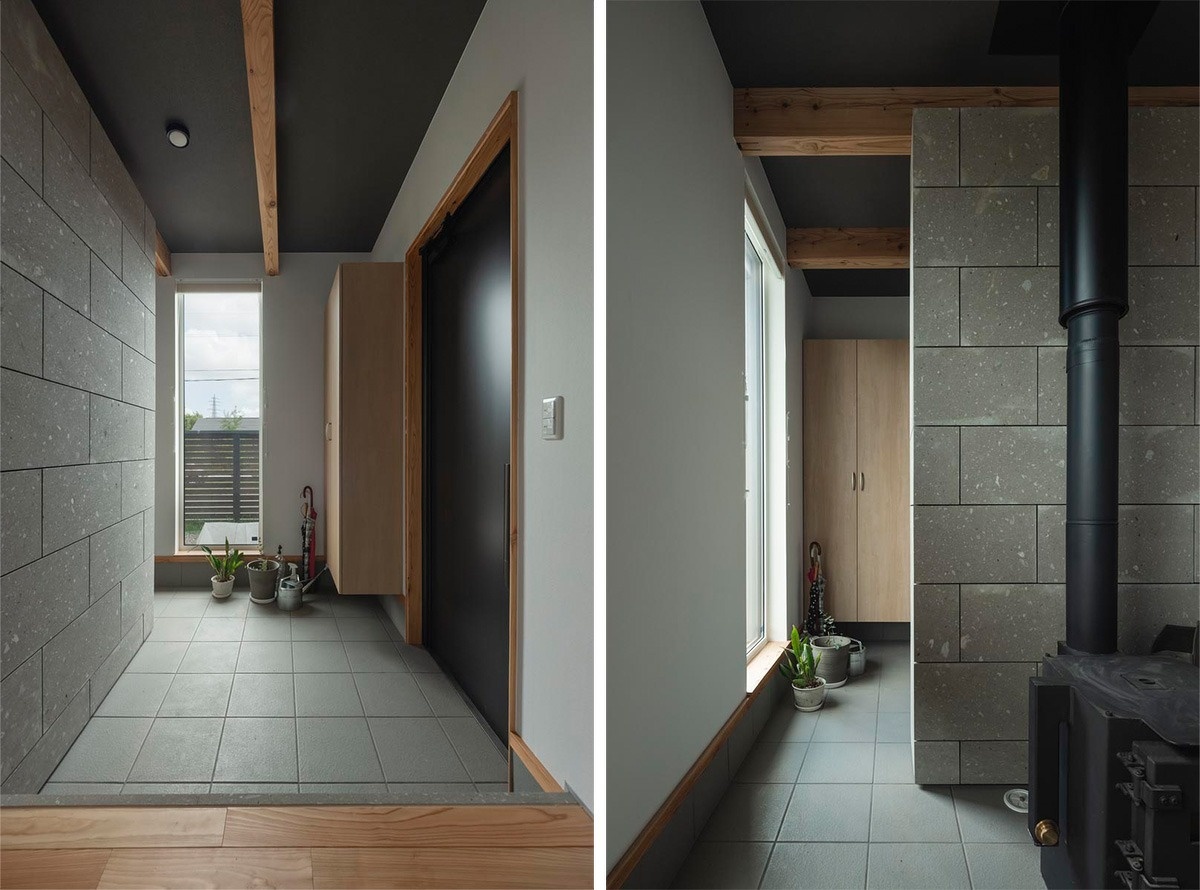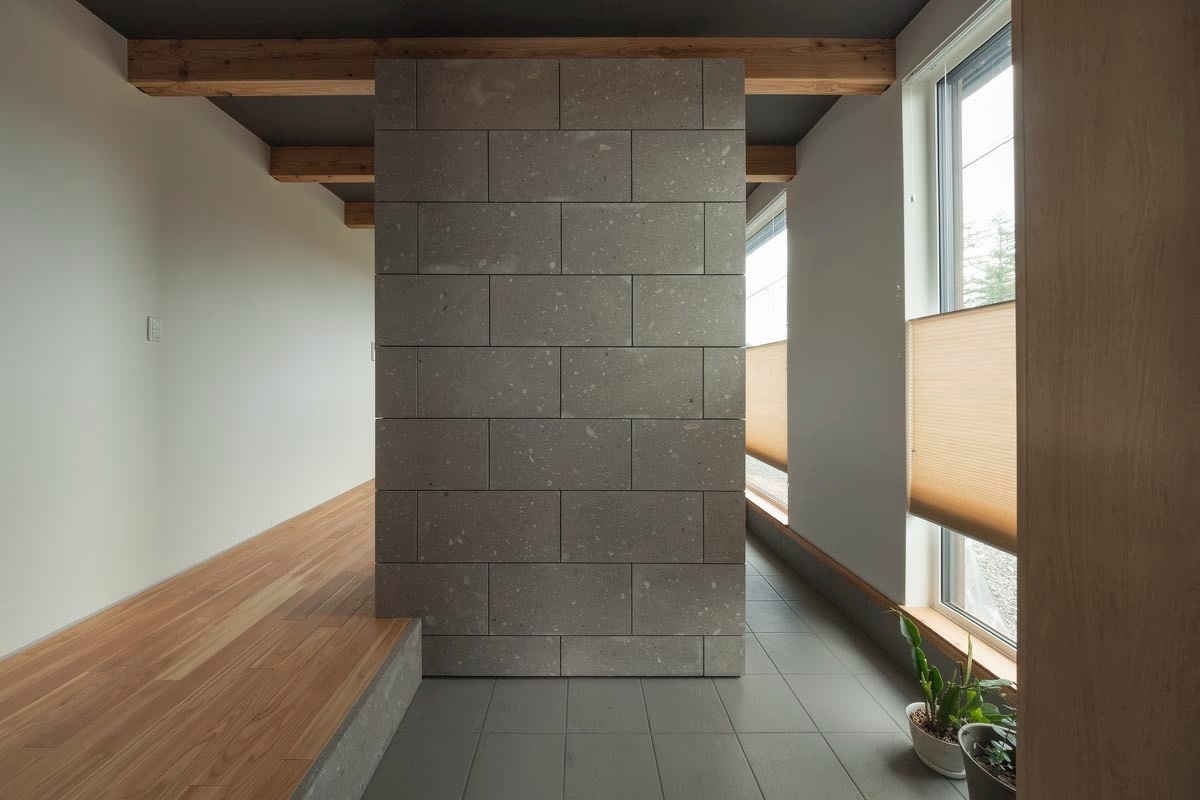 玄関の土間は奥のLDKと一続きの空間。写真中央にある札幌軟石の壁は、玄関からの視線を遮ると同時に裏面に置かれた薪ストーブの防火壁にもなっています。