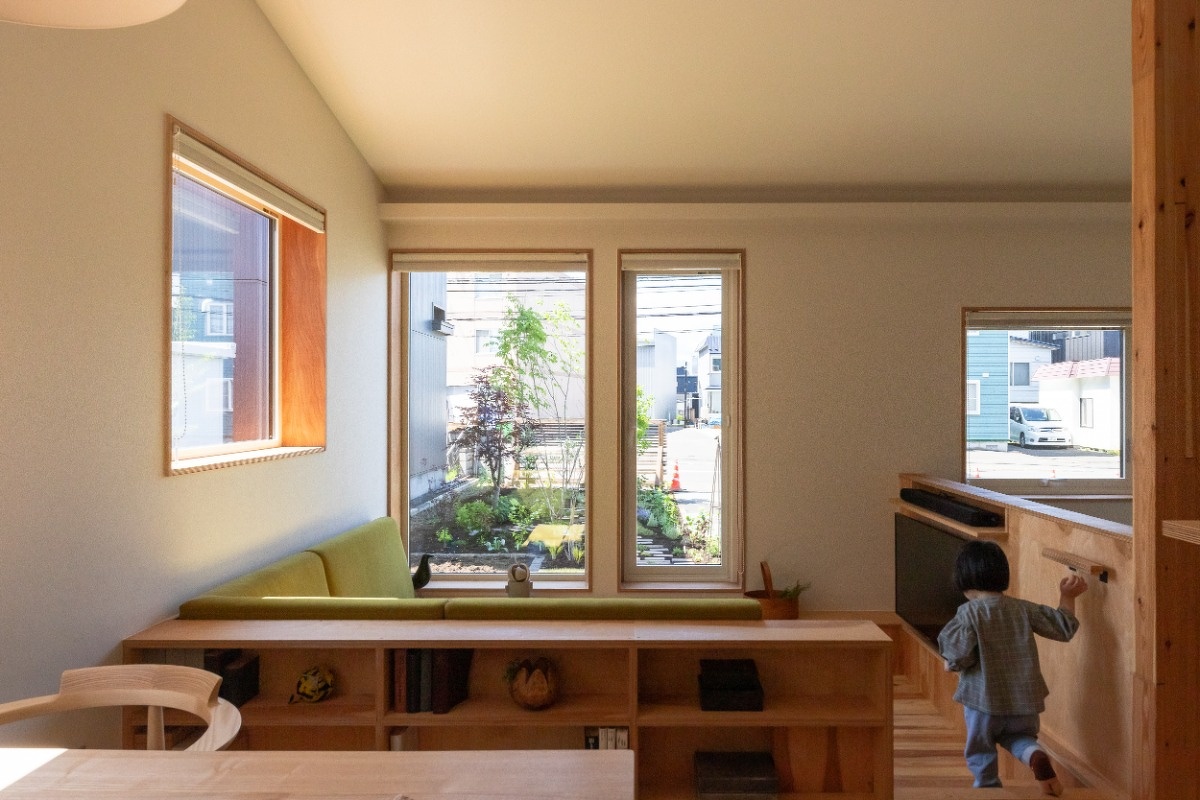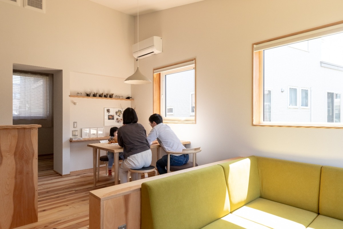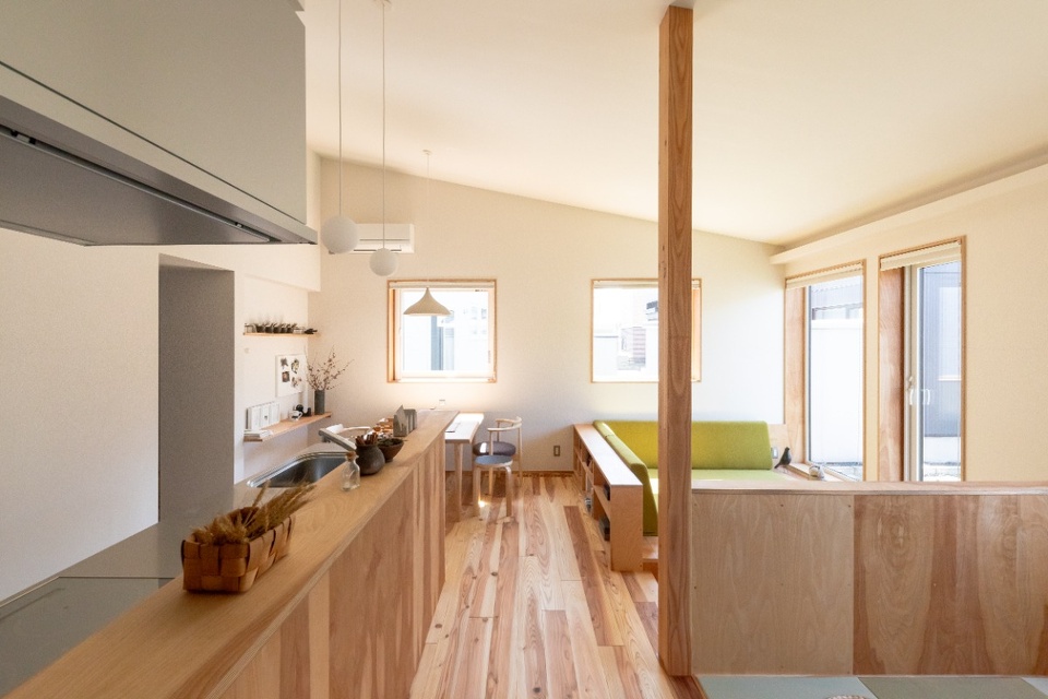 キッチンやタタミコーナーの腰壁は、道産シラカバ間伐材で作るエコシラ合板を採用。