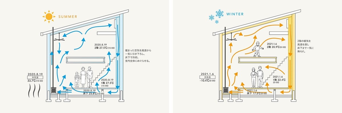 室内に新鮮な外気を採りこみ、「風道」を使って家全体に適温の空気を巡らせる、エコで省エネな冷暖房システムです。