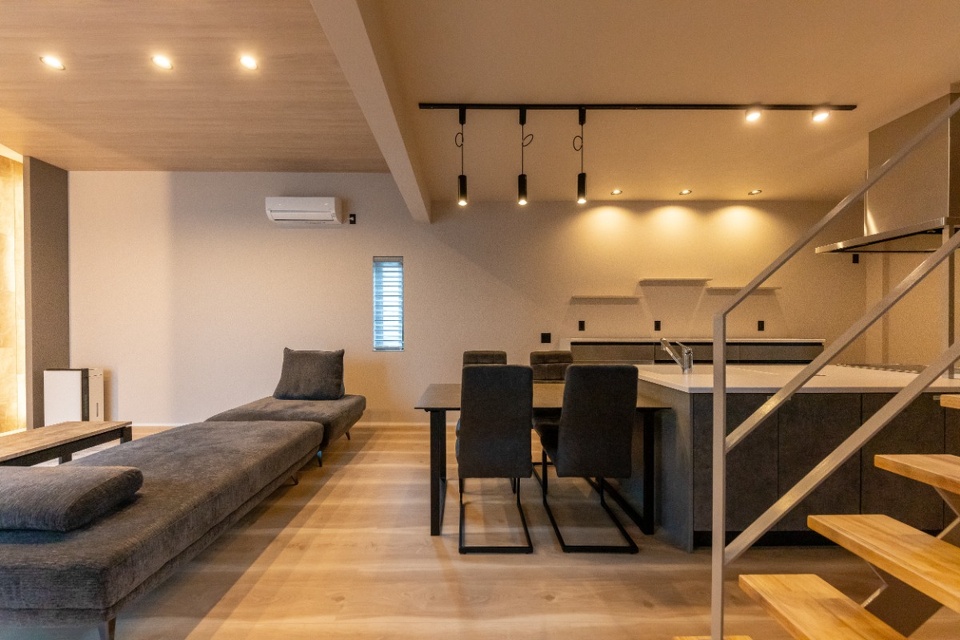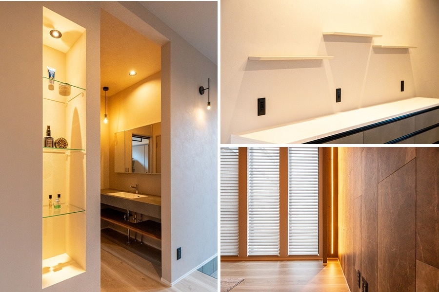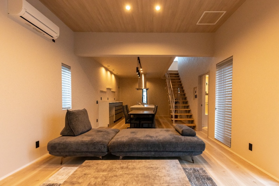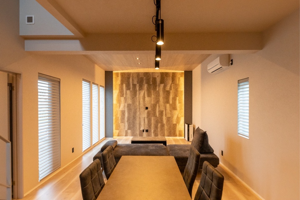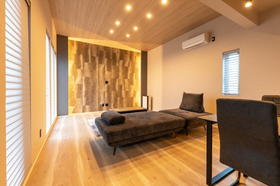 ホテルで過ごすような寛ぎの時間を演出するために、間接照明にもこだわりました。例えばお子さんの寝かしつけが終わってから、照明のトーンを下げてご夫婦でお酒や映画を楽しむといった過ごし方をイメージしています。