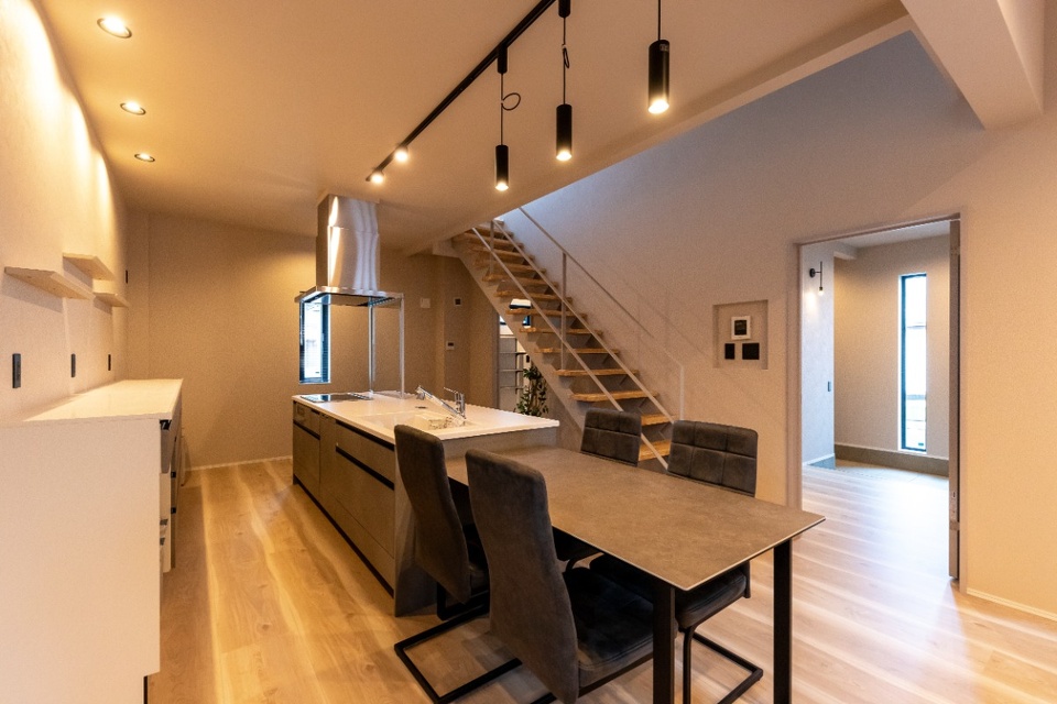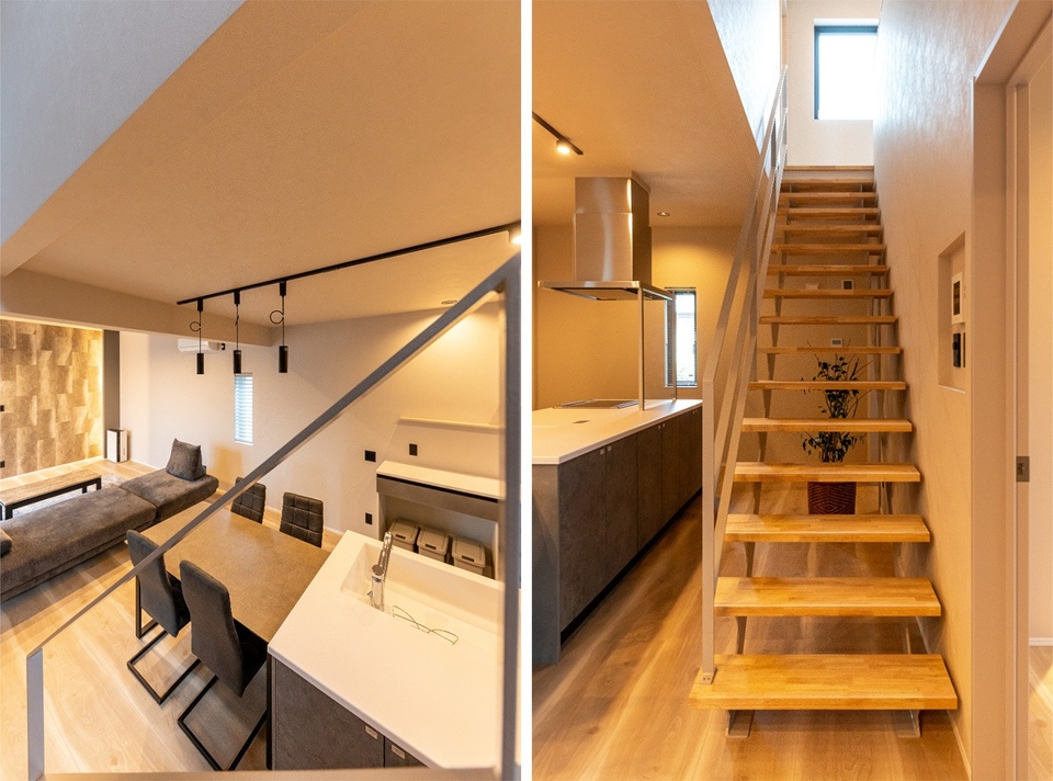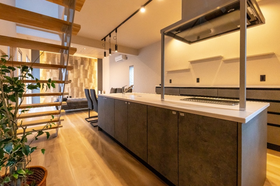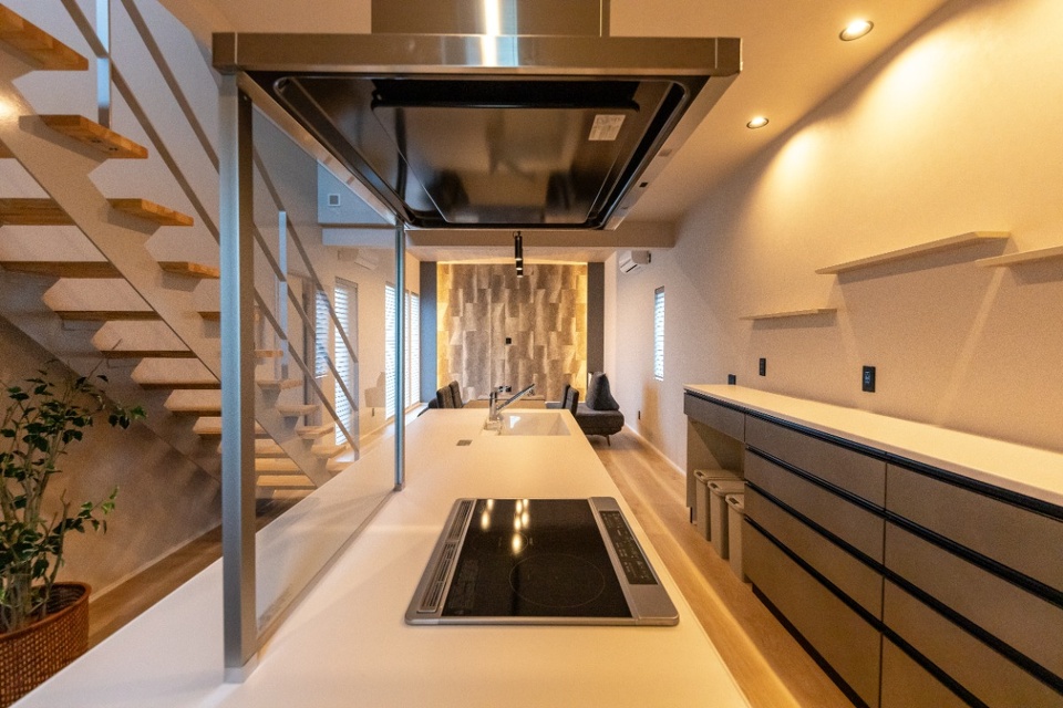 キッチンに立つと1階の様子や階段を行き来する家族の様子が見渡せる造りです。