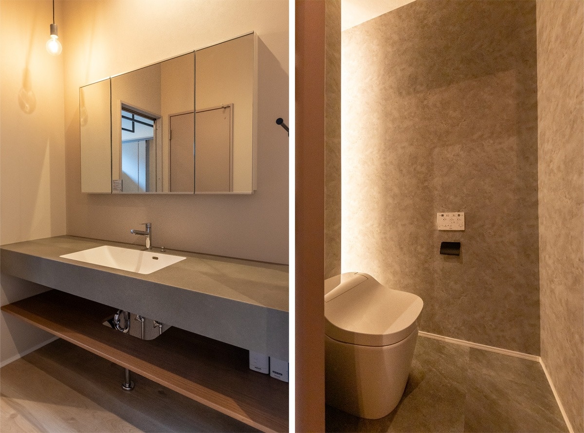 電球型のペンダントライトが優しい光を放つ洗面化粧室。コンクリート調の洗面化粧台はアイカ製です。大理石調に仕上げたトイレはまるでホテルのような空間。