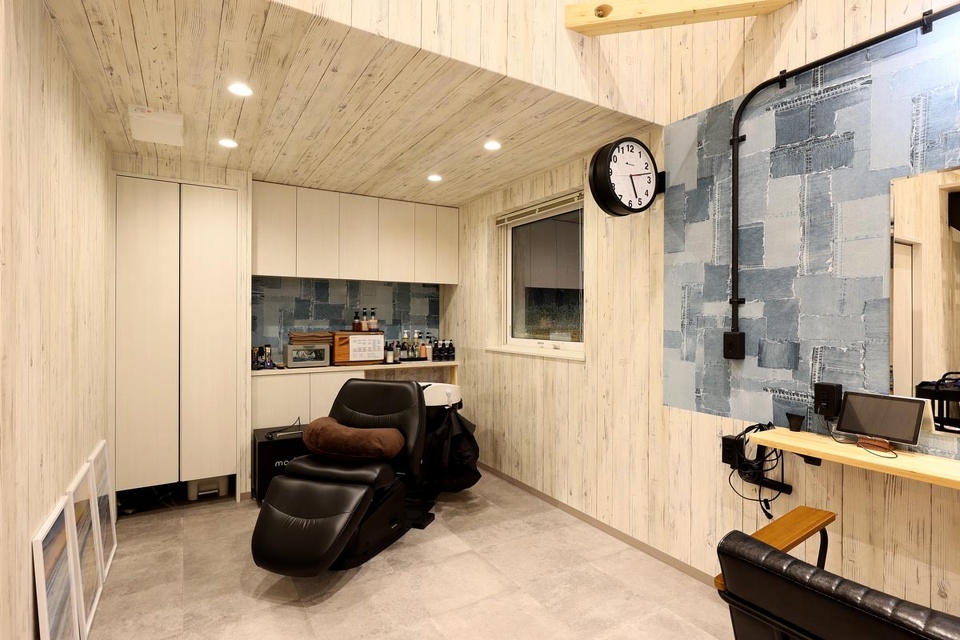 吉川さんが希望した内装イメージは「西海岸風テイスト」。また、お客さまが座る席のまわりにはインダストリアルデザインを感じさせるアイテムを置きたいと、生杉建設の担当者と相談してマリン灯や壁付けの時計を選びました。