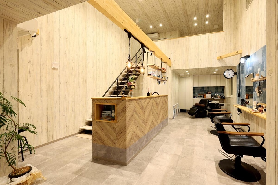 カラーやパーマの施術には、時間がかかります。居心地のよい空間で過ごしていただけるように、吹き抜けやエントランス側の大きな窓、内装のデザインなど、魅力的な店舗づくりにはこだわりました。