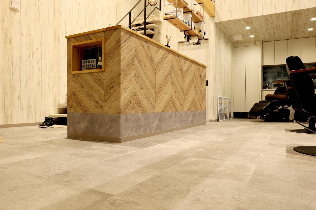 シャンプー台は給排水管設備を床下に設置するため、床に段差ができてしまうことが多いですがこの店ではフルフラットにできるように、基礎の部分から配慮しています。
