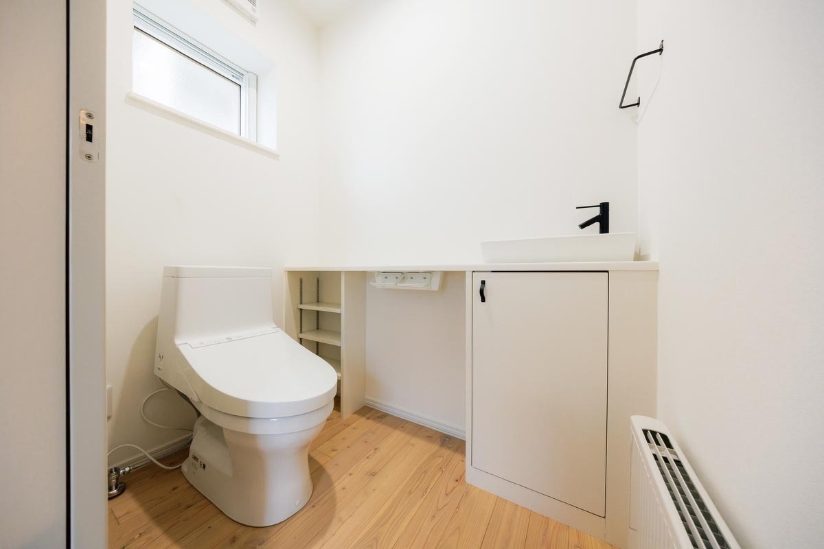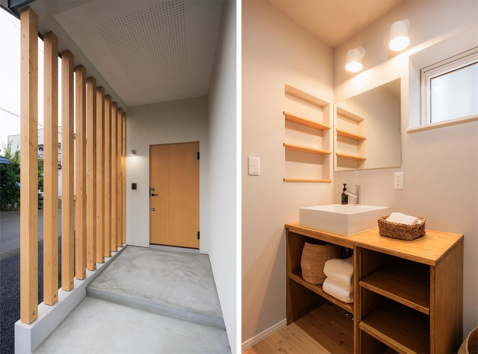 ポーチ(写真左)には風や視線を避ける柱が。洗面台(写真右)やトイレ(写真上)の収納・手洗台はオリジナルの造作です。モダンなデザインの中に木の温かみを感じられる家になりました。
