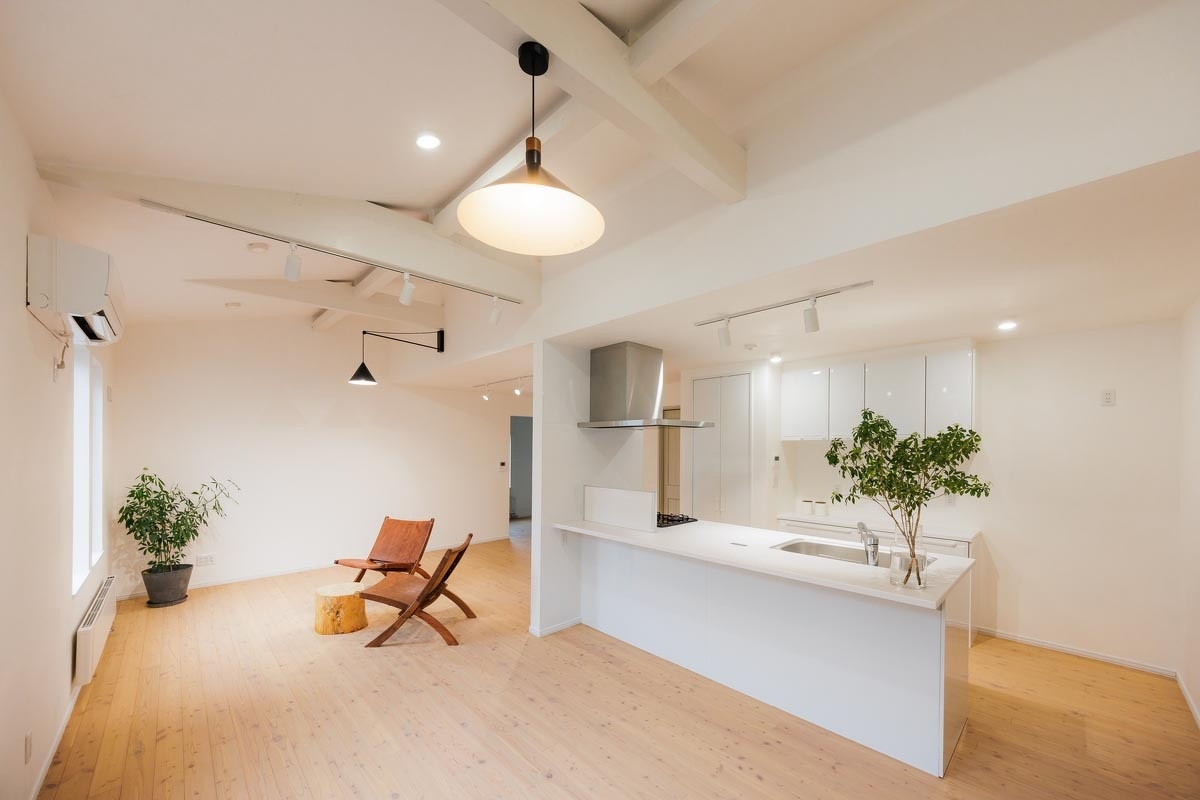 明るくオープンな構造に生まれ変わったLDK。3m30㎝と元の家より1m以上高く仕上げた天井は吹き抜けのような解放感です。