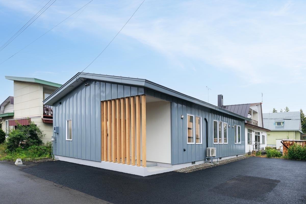 ブルーグレーの外壁はメンテナンスのしやすいガルバリウム鋼板。帯広市内でも利便性の高い立地でありながら、周囲は静かな環境です。