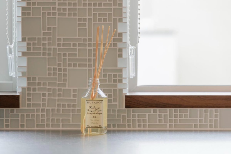 窓辺の光に透ける名古屋モザイクのガラスタイル。窓の幅や高さに合わせるために、タイルの細かな移動などの調整を経て施工されています。