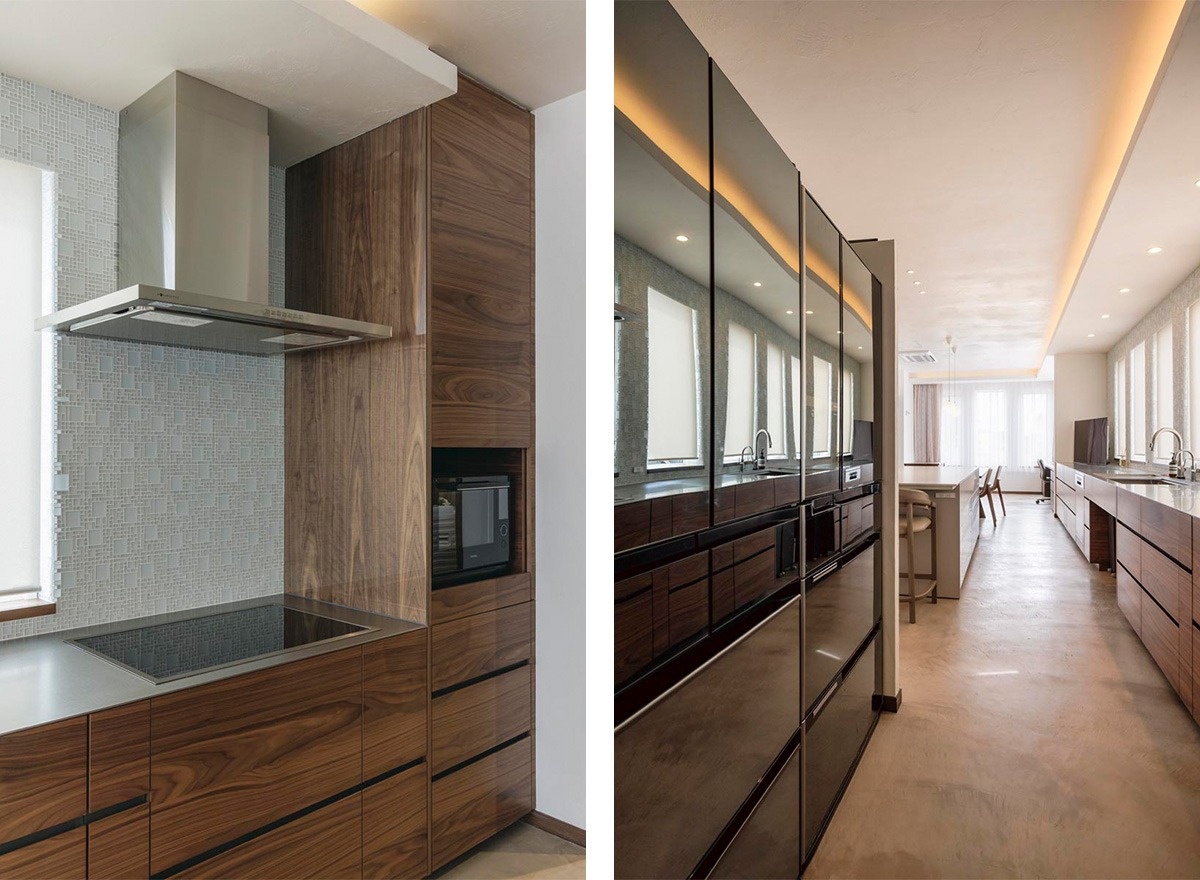 kitchenhouseのフルオーダーキッチンは、吉田社長と一緒に札幌のショールームまで行きプランニングしました。広島から職人が来て仕上げたというワークトップの長さは7.2m。家具のようにも感じられる木製の面材とゆとりのある空間づかいで、落ち着きのある印象になっています。