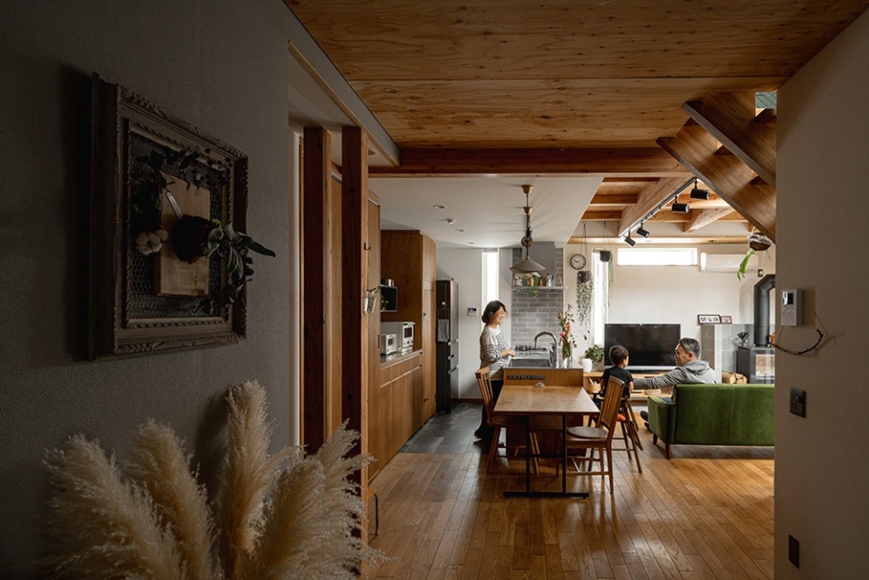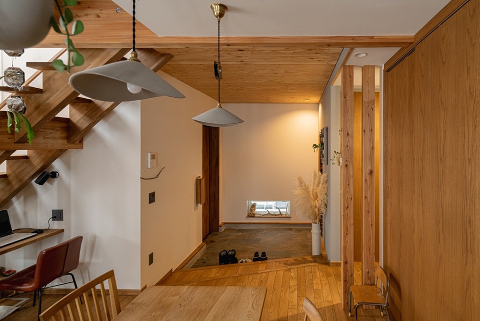 玄関の天井にはカラマツの板を貼っています。床材は1、2階ともにナラ材を使用。このように木を豊富に使いながらも、山小屋のようなやぼったい印象にならないバランス調整によって、いごこちのいい空間に仕上がりました。