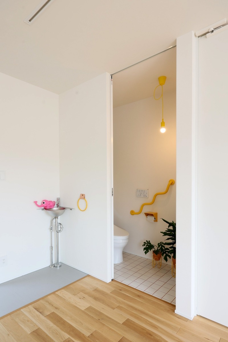 「長期優良住宅」申請のために寝室近くに設置したトイレは、色づかいで遊びました。古道具屋で買ったものの使い道がなかったクネットを手すりにしようと思いつき、床には黄色に合うオレンジ色のカラー目地をチョイス。海外のインテリアを思わせる楽しい配色です。