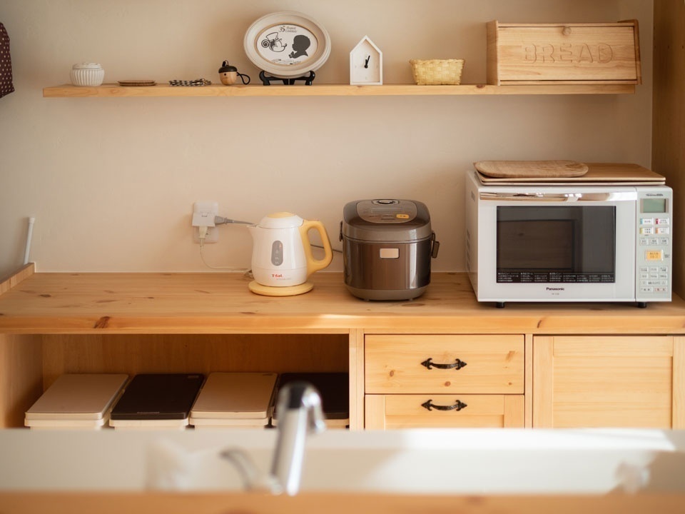 リビング側から手元が見えないカウンターの絶妙な高さと、キッチン収納にも大満足。引き出し式の収納スペースは奥さまが描いたスケッチどおり。「トースターがしまえて感動です!電子レンジとトースターが並ぶのは見た目がすっきりしないなと思っていたので」
