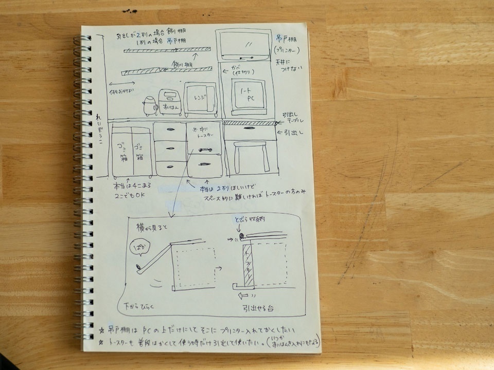 収納も考えて、造作がいいなぁと漠然と思っていたら、夜中にアイディアが降ってきて、絵に描いて朝日社長にお渡ししました。その通りに再現されて感動です!