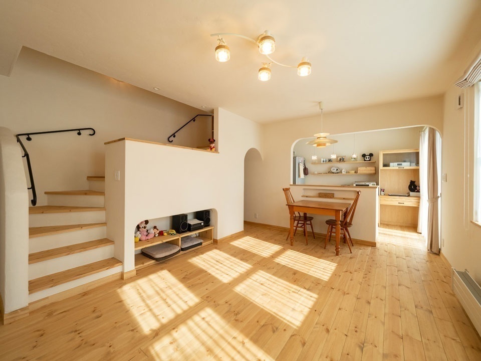 シンプルでナチュラルな雰囲気のリビングダイニング。Hさま邸では、トイレ以外はすべてパインの無垢床材を採用。ソフトな歩き心地の優しさはもちろん、時間とともに色が変わり、味わい深くなる無垢床は、見た目にも温かみがあります。