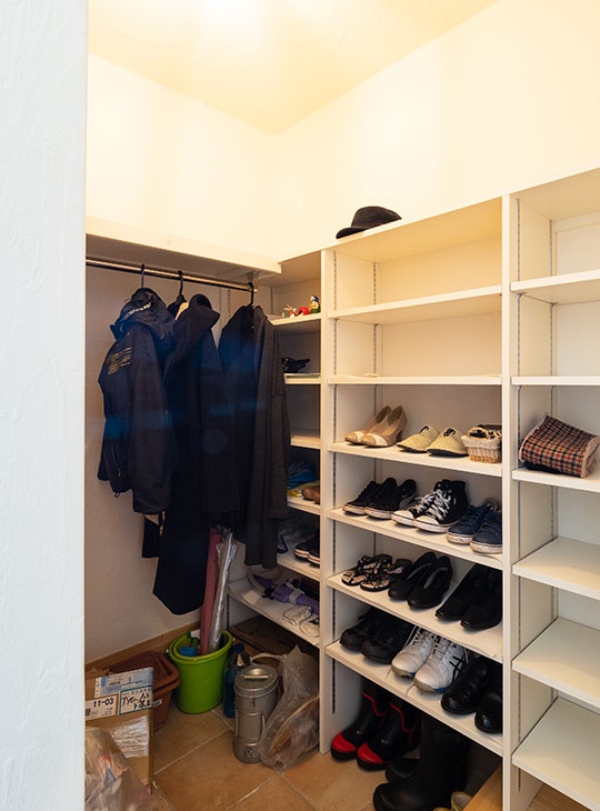 玄関に入るとウォークスルータイプの大型シューズクロークが。すぐ使いたいもの以外はすっきりと片づけることができます。