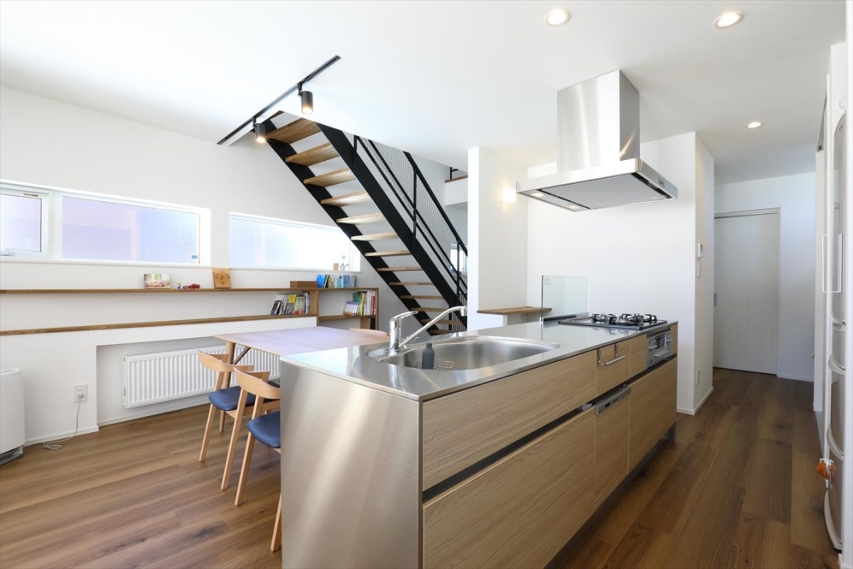 アイランドタイプのキッチンは、奥さまの希望でシンプルなステンレストップになりました。