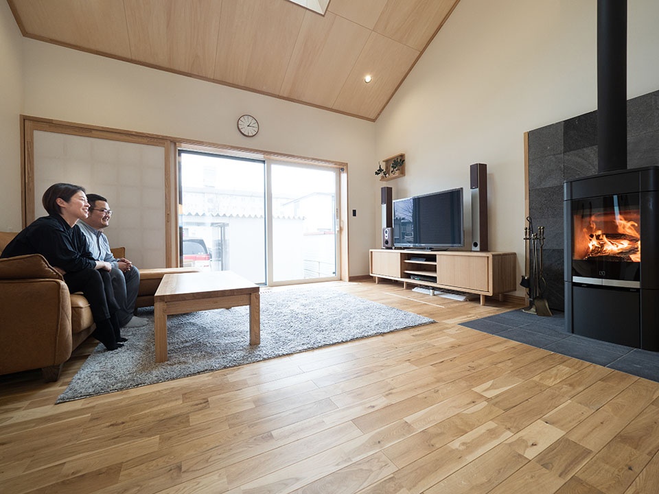 「光熱費は、本当に安いですね」と声をそろえるMさんご夫妻。暖房はエアコン、給湯はエコキュート、調理はIHのオール電化なのですが、昨年12月の電気代はエアコンを使わなかったので月額1万円を切っていたとか。さらに、Mさん邸は太陽光パネルを設置しているので、売電した金額を換算すると、年間光熱費は実質ゼロ円になる見込みです。住宅の断熱性能がいいので薪ストーブメインで暖かな暮らしができるのです。