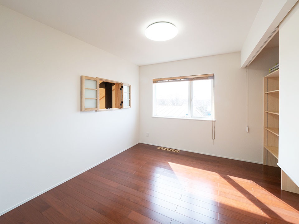 2階の洋室には、布団がたくさん入る大きめの収納も設けています。Mさん邸は、壁に小窓を多く設けているのも特徴的。パッシブ換気で空気の通りをよくするためもありますが、家族が増えたときに、お互いの気配が分かるようにしました。