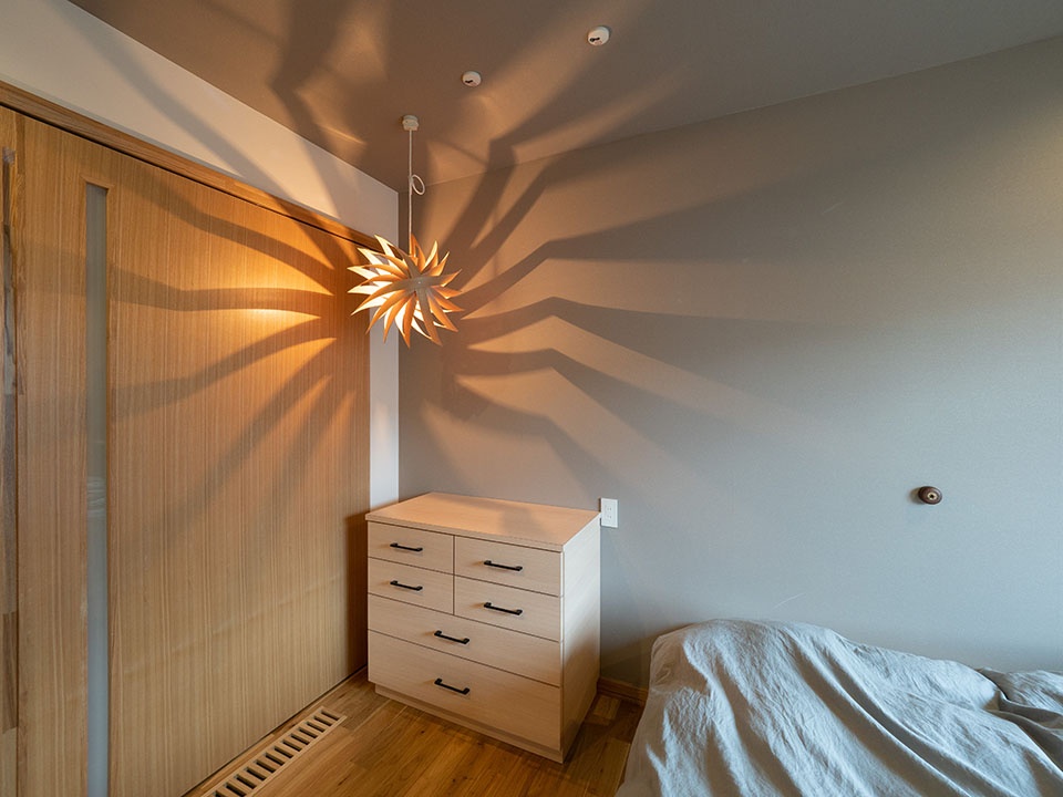 寝る場所といえば2階、と思っていたというご主人も、奥さまの熱意に押し切られる形で寝室が1階のプランを承諾しました。「リビングやお風呂からすぐ入って寝られるのでラクですね~」。寝室の照明は、光と影が美しく映し出される「WAPPA SHADE 風車」がステキです。照明作家、谷俊幸さんの作品です。