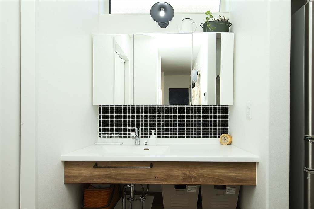 洗面ボウルの下もあえてトビラをつけずに、見せる収納に。