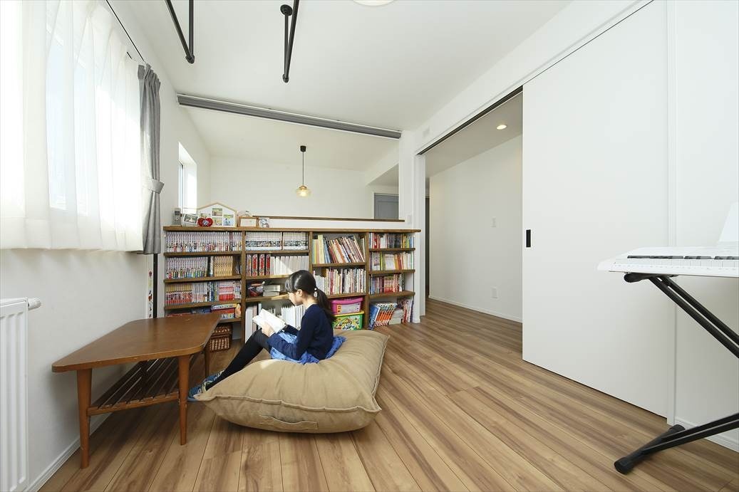 2階の階段わきにあるフリースペースは、子どもたちが「マンガスペース」と呼んでいる遊び場ですが、いざとなるとロールスクリーンと引き戸で空間を仕切ることができ、客間として使えるようになっています。