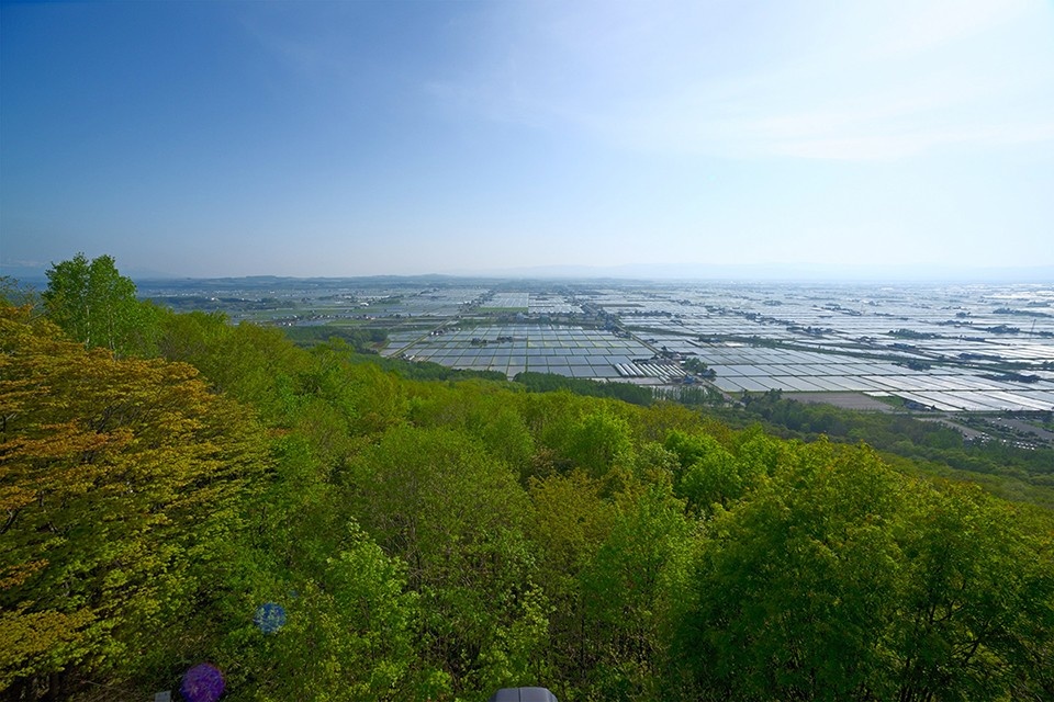 キトウシ森林公園からの東川町の眺めです。見渡す限り水田が広がる田園地帯。奥には十勝岳や旭岳などの山々。
