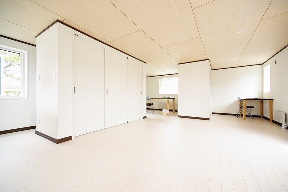 優子さんの要望を踏まえ2階はこんな間仕切りのない空間に。お友達が泊まりにくると、ココにテントを2つ張って、室内のキャンプ生活を楽しむのが大人気です。