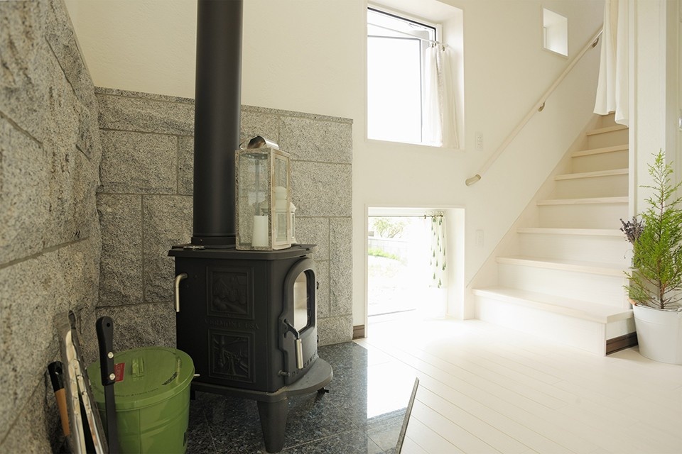 一階には主暖房の薪ストーブがあります。耐熱用の石材は石屋さんに相談して半端な材料を組み合わせて施工。コストを抑えながら素敵なデザインを実現しました。