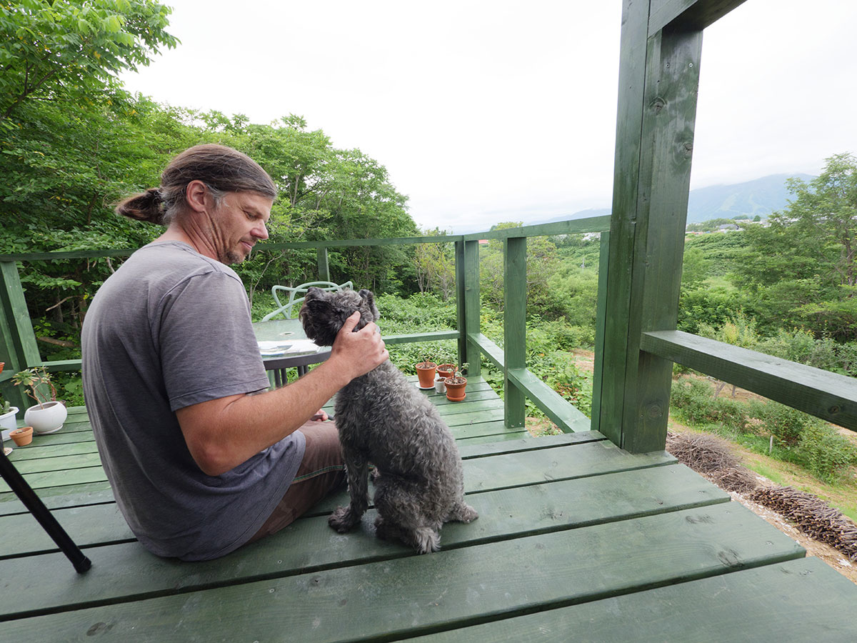 愛犬コルと腰かけているのは、2階の室内から続くバルコニーの手前の部分。3畳ほどのスペースを1段下げたことで、ベンチのように座って使えるだけでなく、手すりの高さも下がるので、室内からの眺めが手すりで邪魔されないようにと考えたそう。なるほど!目からうろこです。