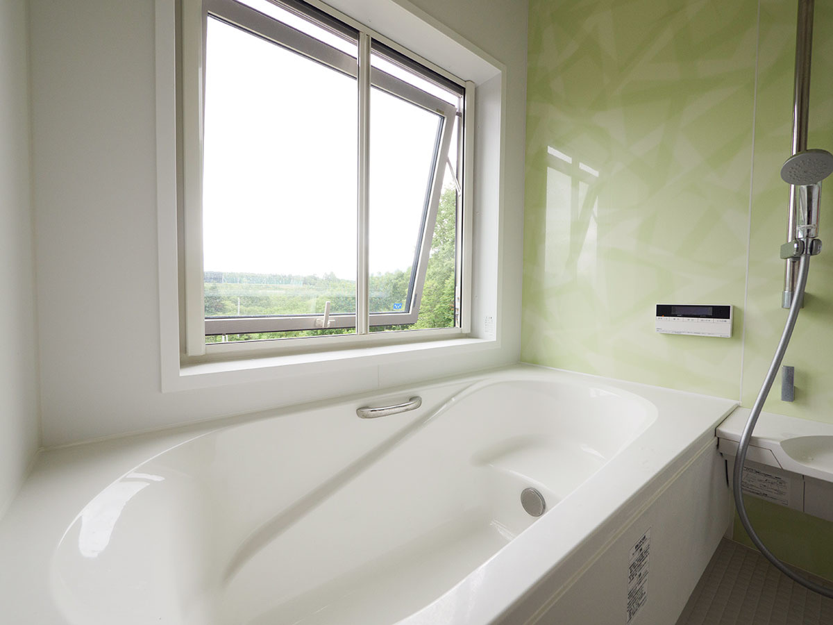 目隠し無しで開放感たっぷりのバスルーム。広大な景色を眺めながらの森林浴は、プレミアムなひとときを過ごせそうです。隣家からは数十メートル離れているため、バスルームの窓から見える人影といえば、遠くのニセコビレッジで雪山を滑走するスキーヤーくらい。そんなオープンな空間ですが、なかなか慣れないという奥様は、隠れながらの入浴タイムだとか(笑)。