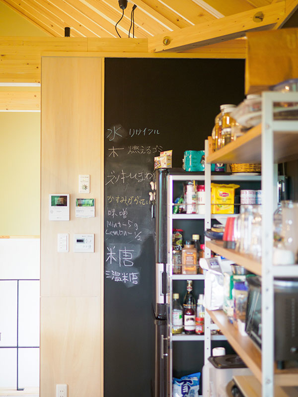 ご主人が一目で気に入ったというセラミック天板のアイランドキッチンです。傷つきにくく、熱いお鍋などを一時的に置いても変色しないそう。少しぐらいならラフに扱っても大丈夫そうですね。キッチンラックの裏側の壁は、Rさんご自身が黒板塗料を塗りました。
