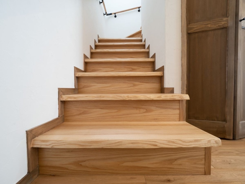 2階にあがる階段。階段の踏み板部分に注目です。「耳付きです」とキタクラフトの加藤社長。