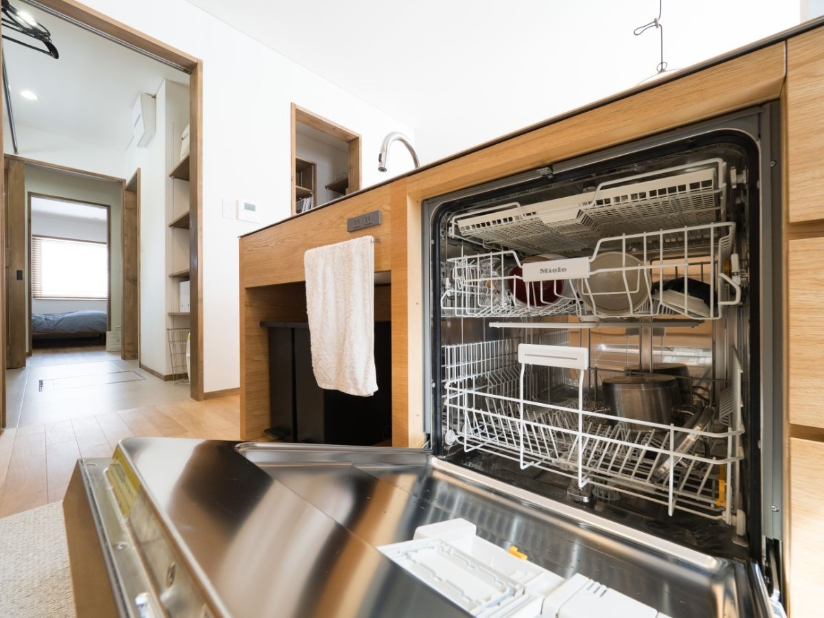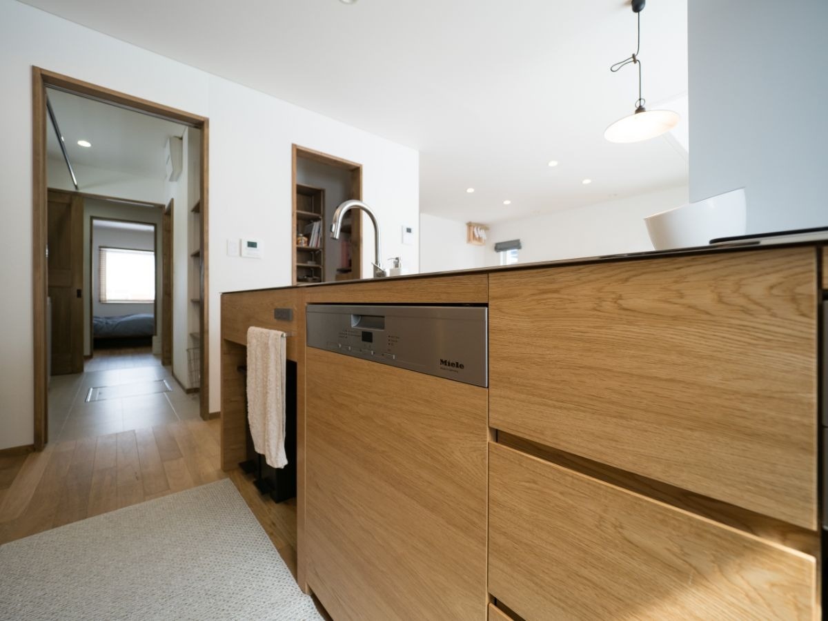 ミーレの食洗器も内蔵。60センチ幅の大容量で、扉が全開になるので大容量の食器を一気に洗うことができます。「お鍋なども入れられるし、汚れ落ちもよいので、家事の手間が減ってうれしいです」と奥様。