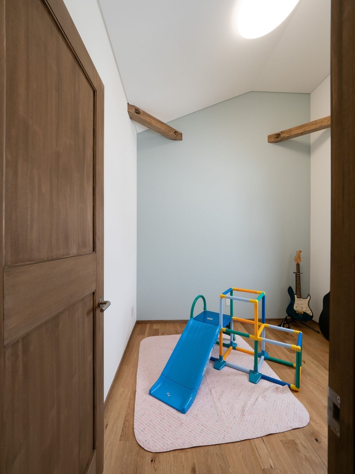 S邸は、ガルバリウム主体のシャープな印象の強い外観ですが、ワンポイントとして外観は一部(玄関まわり)を木(ホワイトアッシュ)にしました。オークの色味に塗装してブルーとの色味をコーディネート。自然素材いっぱいの室内を予感させる、やさしい雰囲気のエントランスです。
