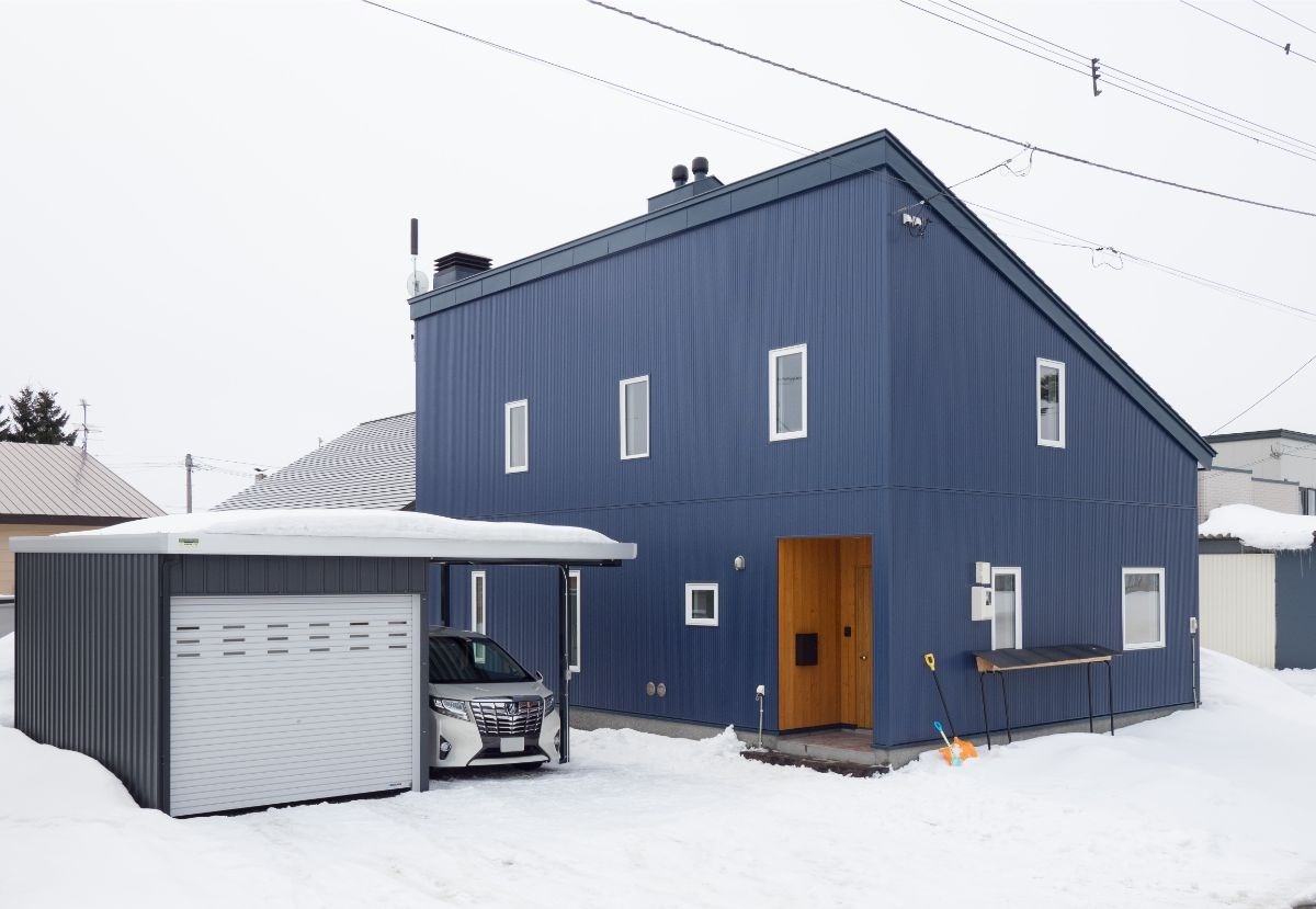 外壁はさわやかなブルーが印象的なガルバリウム鋼板。屋根からの雪処理も一か所の除雪で済むメリットを踏まえ片流れ屋根を採用しました。