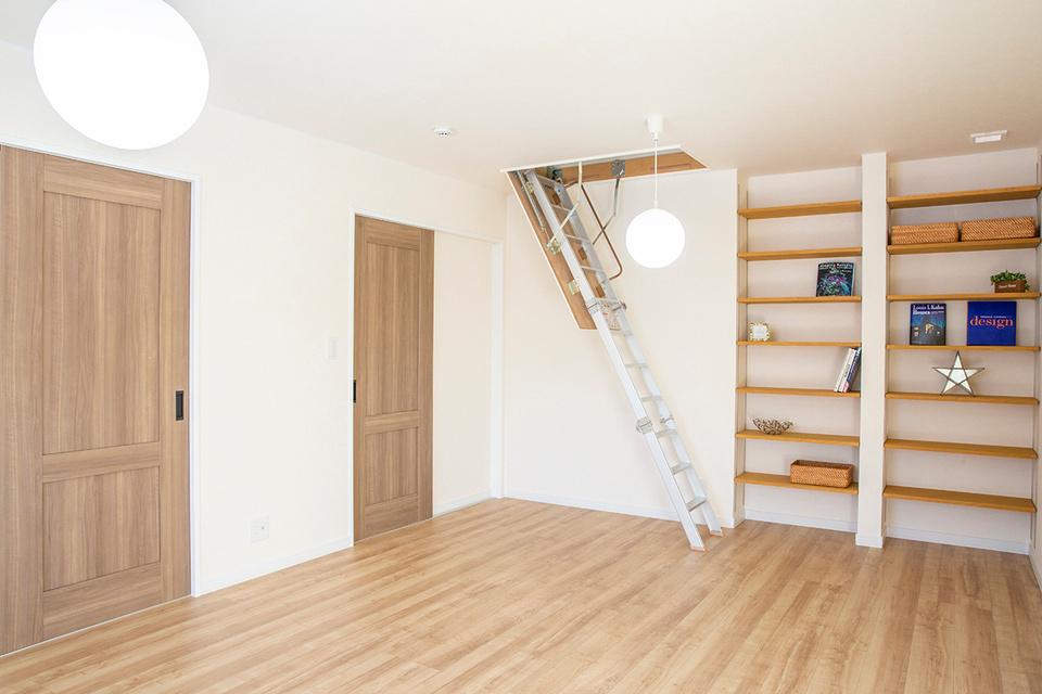 屋根裏収納のついた個室は、将来的には仕切り壁を付けて子供部屋にも